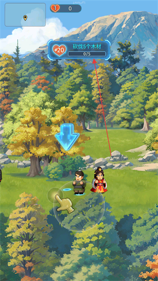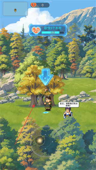 1、根据任务提示砍伐木材,移动角色到树木处,完成砍伐以获取资源,积累进度。
