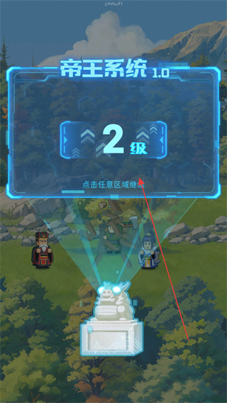 3、完成任务后,帝王系统升级如升至2级,点击任意区域继续游戏,解锁新功能或提升属性。