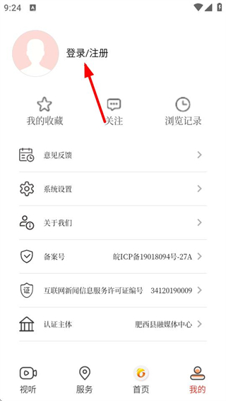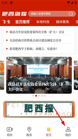 1、在肥西融媒首页,点击右下角我的选项,进入个人页面。
