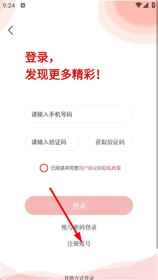 3、在登录页面,点击注册账号选项,进入注册页面。