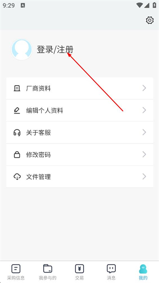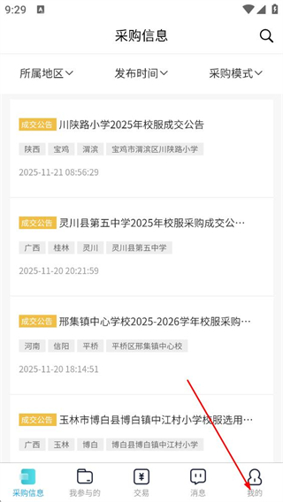 1、在采购信息页面,点击底部我的,进入个人中心页面。