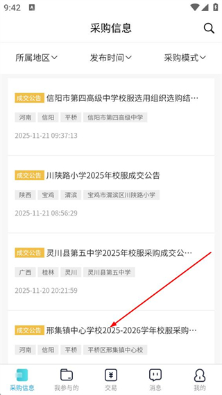 2、在采购信息页面,点击目标采购公告,进入公告详情页面。