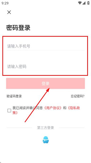 4、在密码登录页面填写手机号和密码,勾选协议后,点击登录完成账号登录操作。