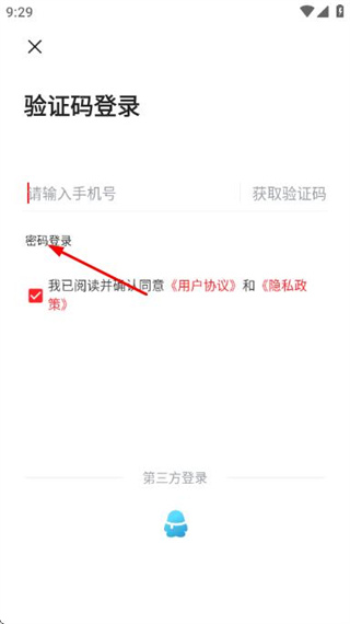 3、在验证码登录页面点击密码登录,进入密码登录页面。