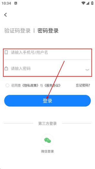 4、在密码登录界面,输入手机号/用户名密码,点击登录,完成登录操作。