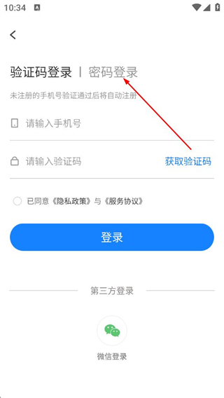3、在登录选择页面,点击密码登录,切换到密码登录界面。