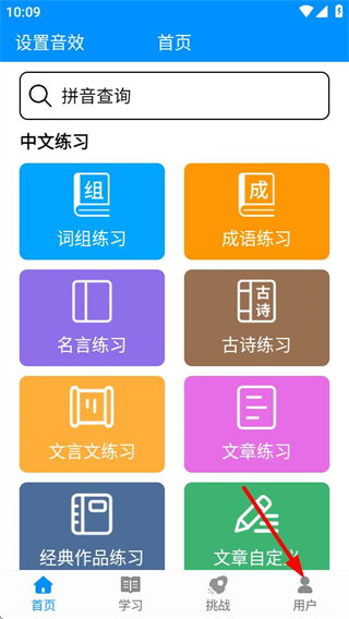 1、在拼音打字练习首页,点击右下角用户选项,进入用户页面。