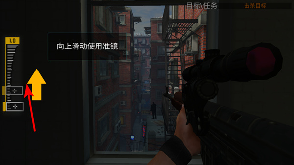 2、向上滑动屏幕可使用准镜,使用后能放大视野,更清晰地观察远处目标,助力精准打击。
