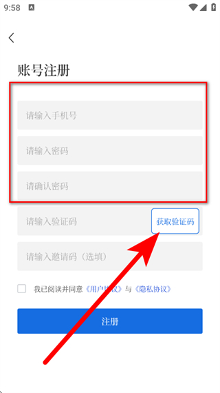 4、输入手机号、密码、确认密码后,点击获取验证码。