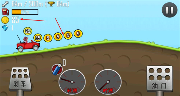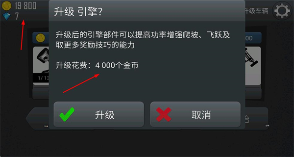 2、积累金币资源,升级赛车引擎等部件,提升赛车性能,增强爬坡、飞跃能力。