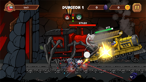 3、在洞穴场景中,继续攻击蜘蛛火车BOSS,同时清理周围小怪,保持火力输出。