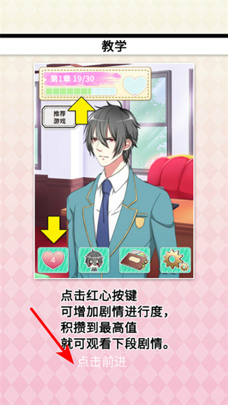 3、点击红心按键可增加剧情进度,积攒到最高值即可观看下段剧情,推进剧情时需关注进度条,及时点击红心按键确保剧情连续推进。