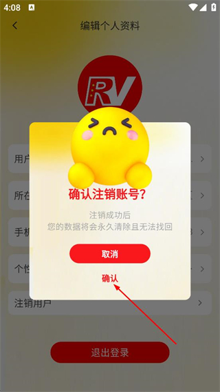 3、在编辑个人资料页面,点击注销用户,弹出确认注销账号提示框。
