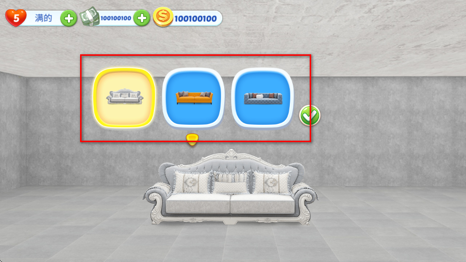 2、在家具选择界面,可从多种款式如不同风格的沙发中挑选喜欢的家具来布置房屋。