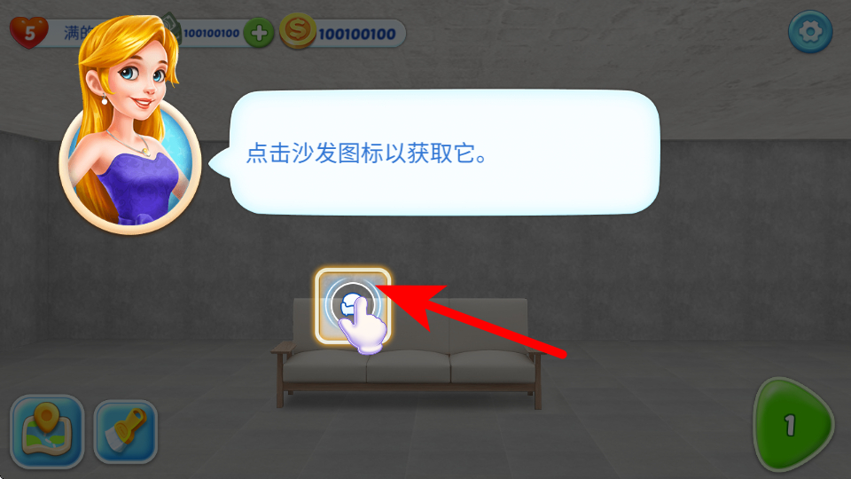 1、根据游戏提示,点击沙发上的图标以获取家具,开启房屋装修的第一步。