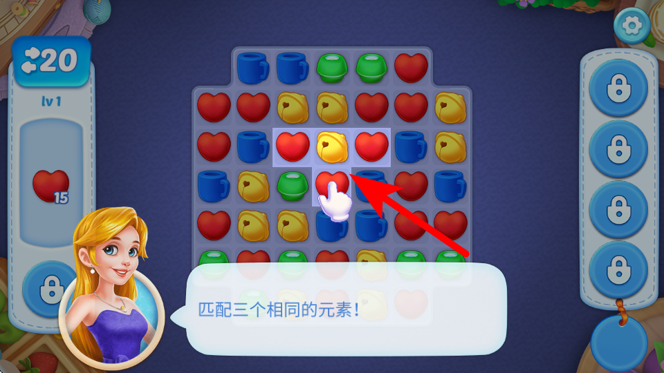 3、参与消除游戏,通过匹配三个相同的元素来获取装修所需的资源。