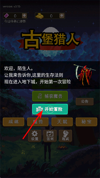 1、游戏中点击开始冒险可进入地下城挑战,进入前可查看游戏功能选项,为冒险做好准备。