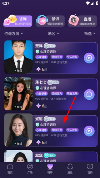 2、在咨询师列表页面,选择目标咨询师如妮妮,进入该咨询师的详情页面。