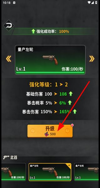 3、升级武器,升级量产左轮等武器,提升伤害和暴击属性,增强战斗能力,助力击败怪物。