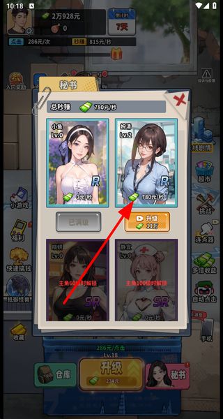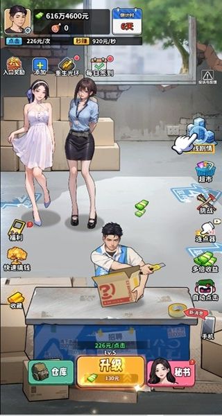 4、可以回家招募并升级秘书,提升秒赚收益,获取更多资源,丰富游戏的养成和经营玩法。