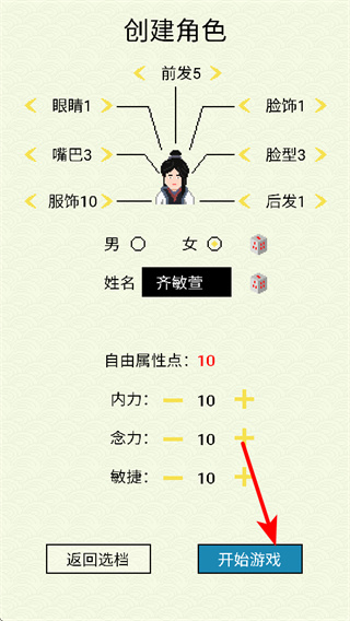 1、游戏中需创建角色,自定义外貌嘴巴、服饰等、性别、姓名,并分配自由属性点,即可进入修仙世界。