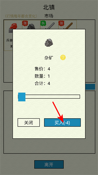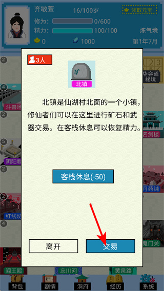 3、进入城镇如北镇后,点击交易可进入市场,交易时可购买矿石、武器等资源,资源可用于修仙和装备强化。