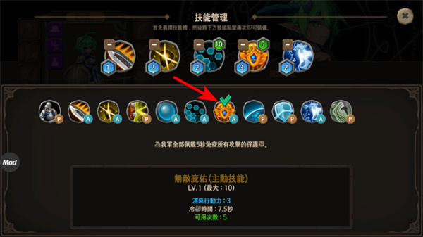 3、在技能管理界面选择技能进行装备,装备时需关注技能效果如免疫伤害,搭配技能以提升战斗能力。