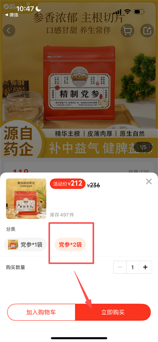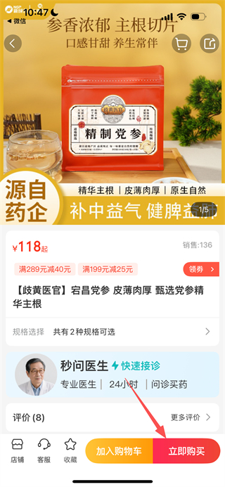 3、在商品详情页面,点击立即购买,进入规格选择页面。