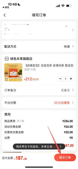5、在填写订单页面,确认信息后点击提交订单,即可完成购买流程。