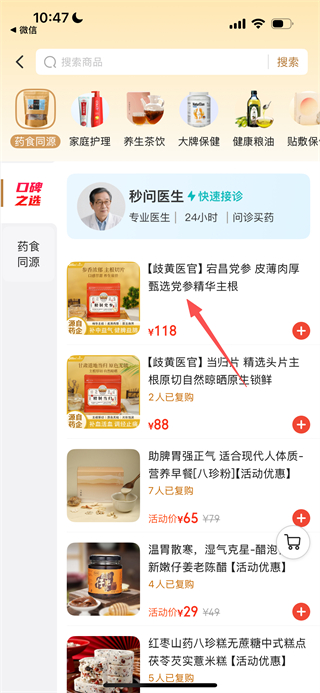 1、在岐黄优选首页,点击分类中的药食同源选项,进入对应商品列表页面。