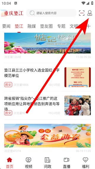 1、打开重庆垫江,点击右上角的个人图标,进入个人页面。