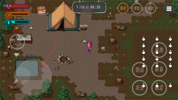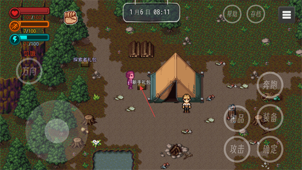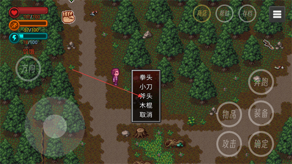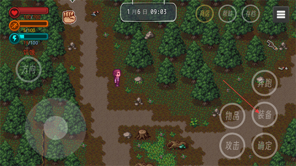 2、通过左下角的轮盘控制角色,在森林中探索获取物资生存。