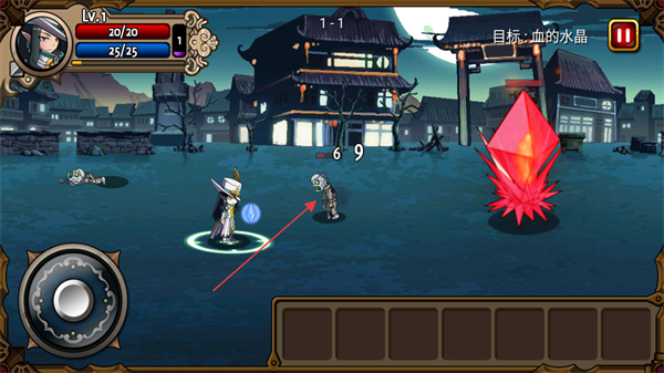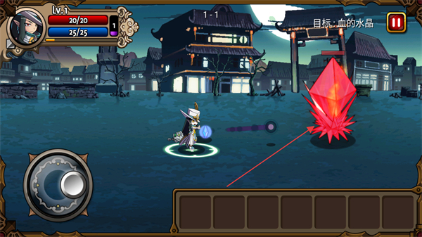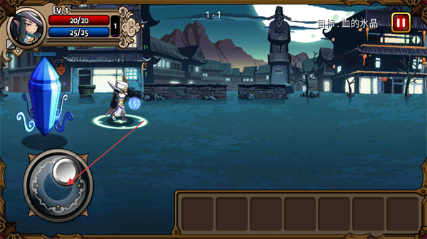 1、通过左下角的虚拟摇杆操控角色移动,在场景中探索,接近血的水晶目标。