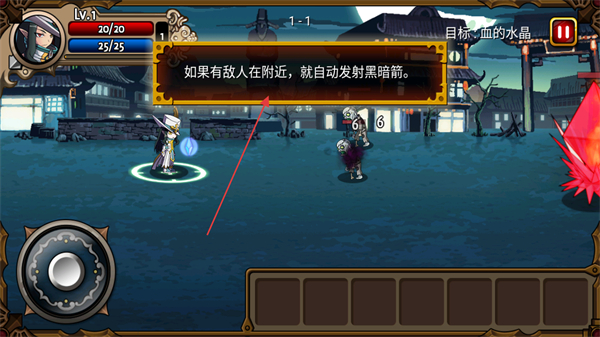 2、当敌人靠近时,角色会自动发射黑暗箭攻击敌人,利用这一机制消灭沿途的怪物。