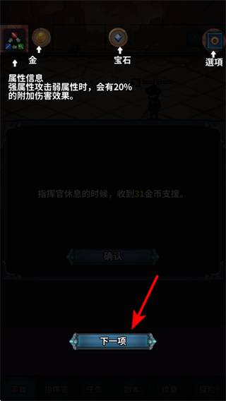 1、游戏中点击下一项可查看新的游戏信息,属性说明和资源获取方式,后续战斗和发展做好策略规划。
