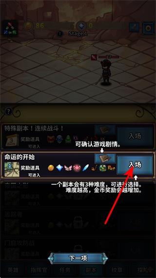 4、点击入场可进入副本场景,进入前可查看副本难度和奖励,结合自身队伍战力选择合适副本。