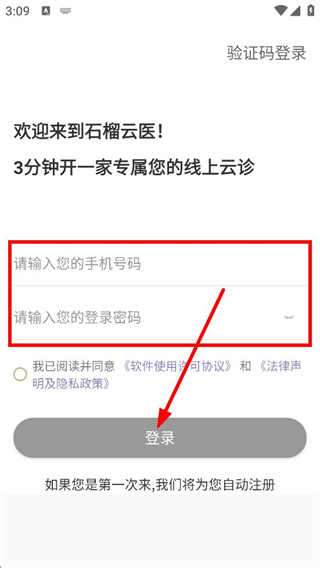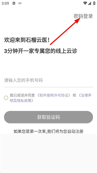 1、在石榴云医温馨提示弹窗中,点击同意,进入登录界面。