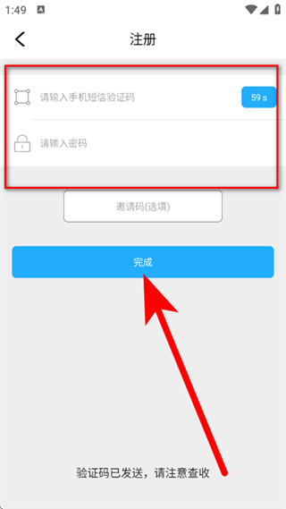 4、输入手机短信验证码、密码,填写邀请码后,点击完成,完成注册。