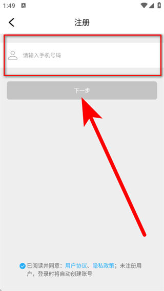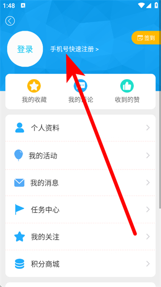 2、在个人页面,点击手机号快速注册,进入注册页面。