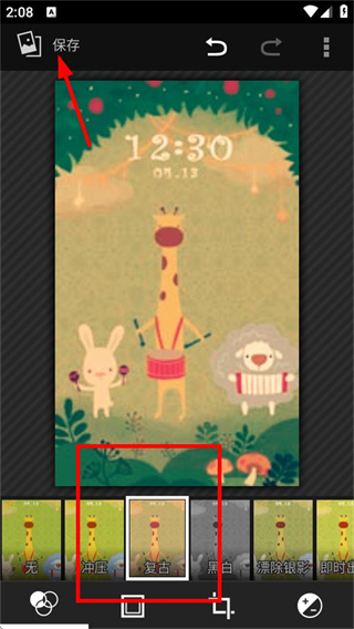 4、在编辑页面,选择滤镜后,点击左上角的保存,即可完成图片编辑并保存。