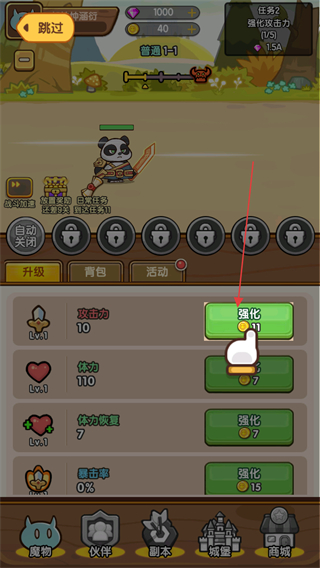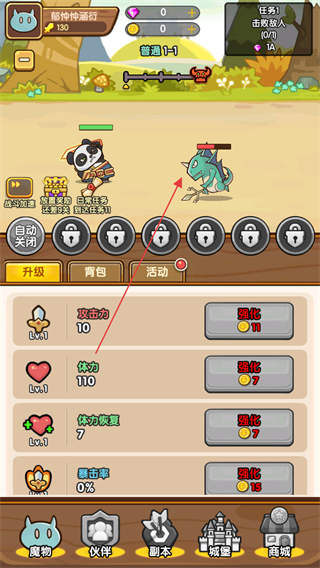 1、进入关卡后,操控熊猫角色与敌人如绿色怪物战斗,通过自动攻击机制消灭敌人,获取金币和经验。