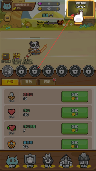 2、完成战斗后,领取奖励如金币、钻石,这些资源可用于强化角色属性。