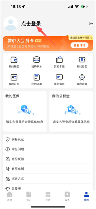 2、在个人中心页面,点击点击登录,进入登录选择界面。