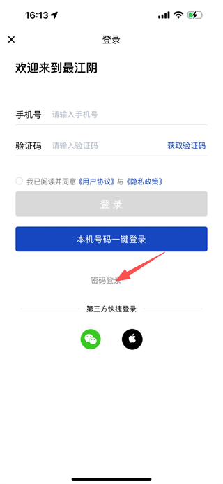 3、在登录选择界面,点击密码登录,切换到密码登录流程。