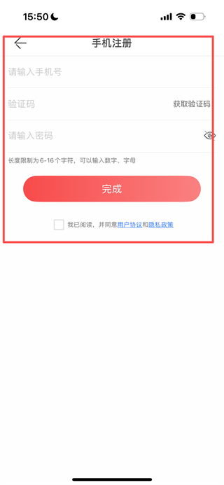 4、在注册页面,输入信息勾选协议后点击完成,完成注册操作。