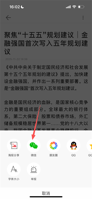 3、在弹出的操作菜单中,选择微信,即可将该新闻分享至微信。