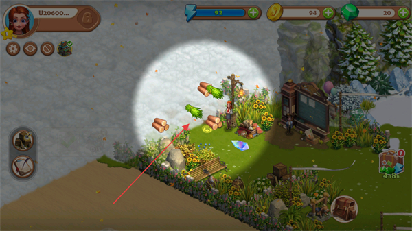 1、在场景中收集木材等资源,这些资源可用于建设和升级农场设施。