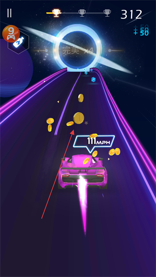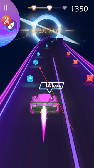1、在充满霓虹特效的赛道上驾驶赛车,通过左右移动赛车来躲避障碍物、收集金币和蓝色宝石等资源。