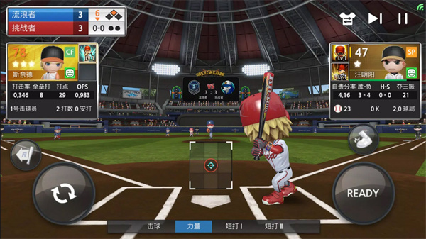 3、做好击球的准备后按下READY的按键,投手将开始投球,这是开启击球环节的关键的操作。