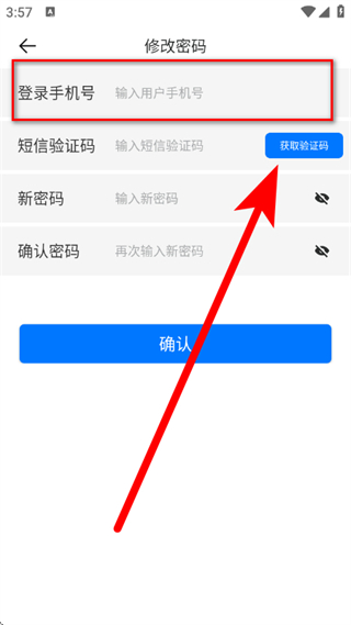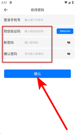 4、输入短信验证码、新密码、确认密码后,点击确认,完成密码修改操作。